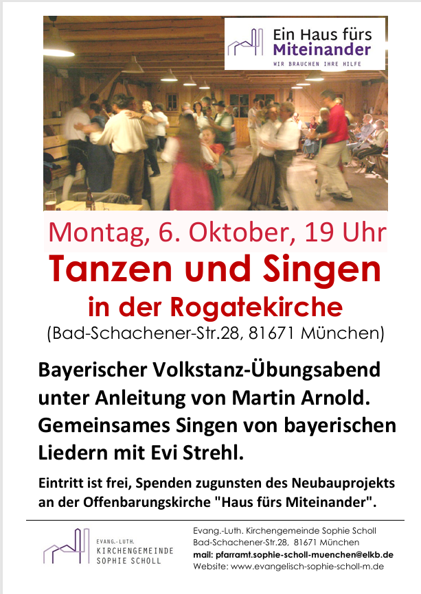 Am Montag, 6. Oktober laden wir um 19 Uhr wieder in den Gemeindesaal der Rogatekirche am Innsbrucker Ring in der Bad-Schachener-Str. 28 ein. Unter der Anleitung von Martin Arnold besteht die Möglichkeit, sich ein paar bayerische Rund- und Figurentänze in Ruhe genauer anzuschauen und zu erlernen. Evi Strehl lädt dazwischen zum Mitsingen von bayerischen Liedern ein. Für das leibliche Wohl sorgen die bewährten Helfer der evang. Sophie-Scholl Kirchengemeinde, deshalb Anmeldung erbeten an: Evi.Strehl@gmail.com. Der Eintritt ist frei, Spenden zu Gunsten des geplanten Gemeindehausneubaus „Haus fürs Miteinander“ werden erbeten.